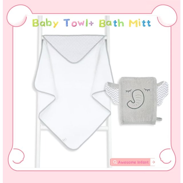 灰色大象嬰兒毛巾+洗澡手套